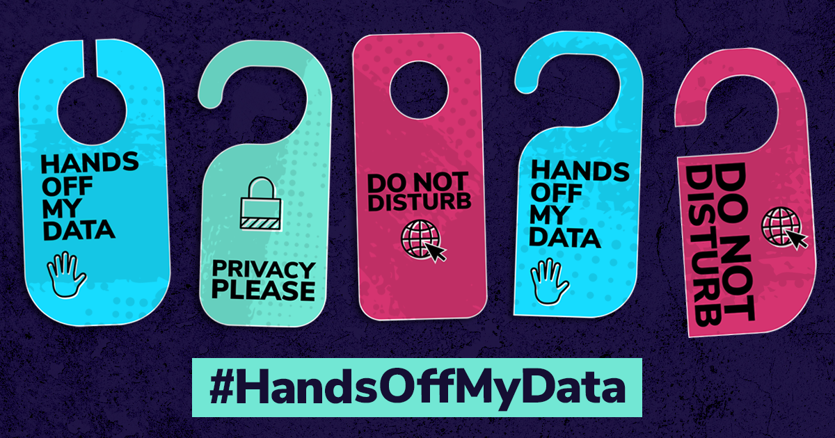 • Original visual identity for the #HandsOffMyData campaign, centered around a bold “Privacy Please” motif