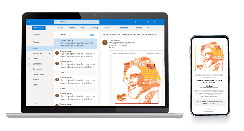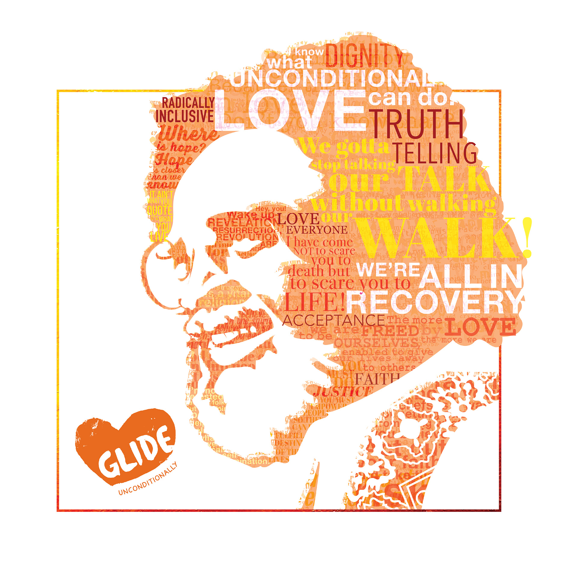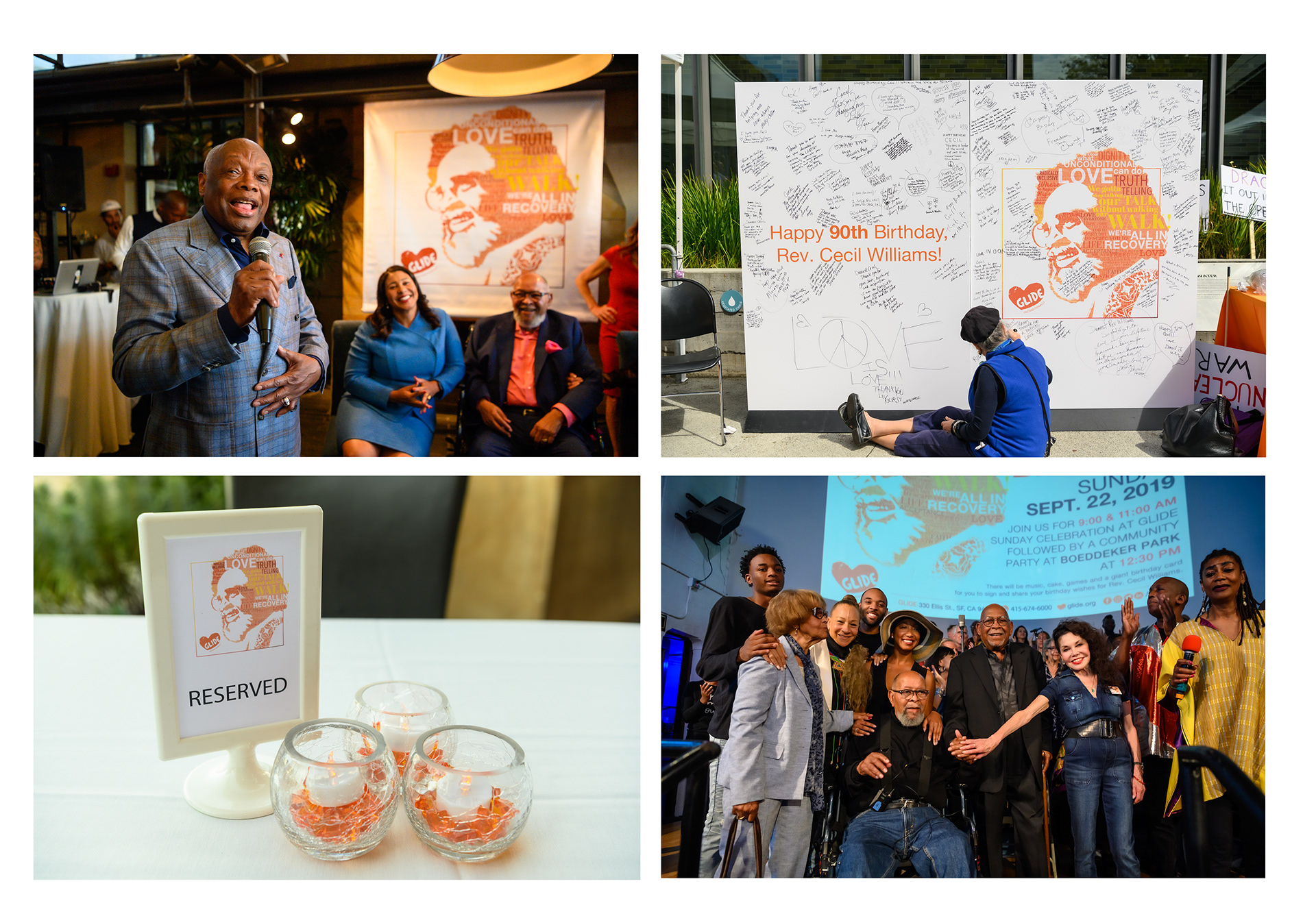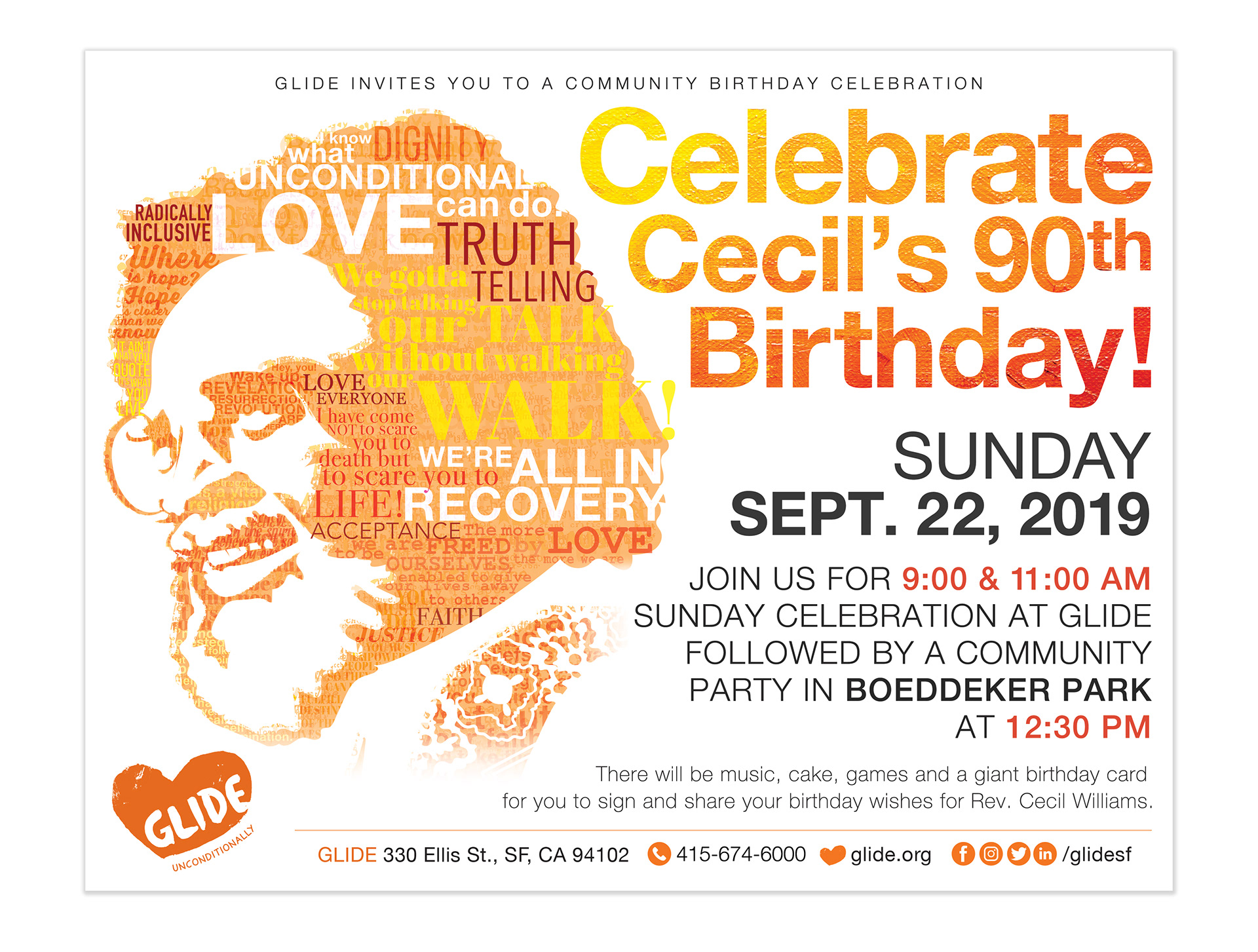 Rev. Cecil Williams is a San Francisco icon. In 2019, Rev. Williams turned 90, and GLIDE wanted to celebrate in the community. For his Birthday, I created custom digital artwork highlighting the GLIDE values and samples of Cecil's sermons and quotes. I scoured the GLIDE archives to find source materials, including photos, old sermons, and handwritten notes, all of which were compiled to create something one-of-a-kind.